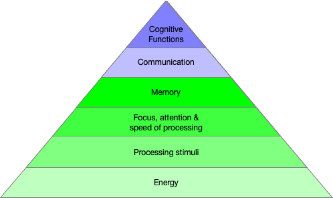 The cognitive pyramid model is a functional model that shows how our brain uses energy for different tasks. It was developed in neuropsychology and is widely used in the rehabilitation of people with brain injury, long COVID, and other conditions that affect brain functions.